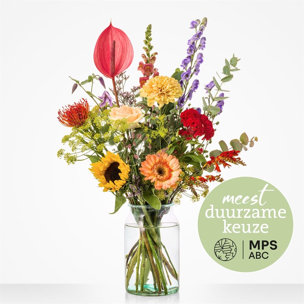 Voor de herfst heeft Fleurop-bloemist Peter van Bloemsierkunst Lemkes een uniek Groen gecertificeerd herfstboeket samengesteld. Dit speciale boeket bevat duurzame najaarsbloemen met een MPS-A+ of MPS-A keurmerk, wat onderdeel uitmaakt van het wereldwijde MPS-ABC certificaat dat de duurzaamheid van bloemen aantoont. Elk boeket wordt samengesteld met op dat moment de mooiste en meest verantwoorde beschikbare bloemen, waardoor elke creatie uniek is. Zo geniet je van een vers, verrassend én duurzaam herfstboeket. Vanwege de natuurlijke variatie kan de samenstelling enigszins verschillen van het voorbeeld, afhankelijk van de beschikbaarheid van seizoensbloemen. Het geleverde boeket kan afwijken van de foto, omdat bloemen nu eenmaal natuurproducten zijn.