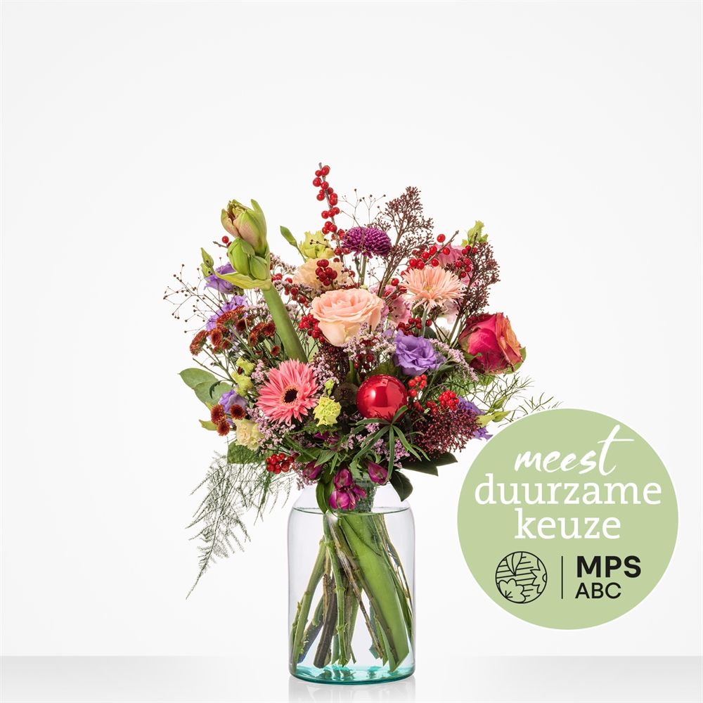 Het duurzame Groen Gekeurd kerstboeket bestaat uit uitsluitend bloemen met MPS-A+ of MPS-A certificering. Onze lokale bloemist stelt dit boeket zorgvuldig samen met dagverse bloemen die aan deze kwaliteitsnormen voldoen. Let op: het getoonde boeket is een voorbeeld, de daadwerkelijke samenstelling kan variëren. MPS-A+ en MPS-A bloemen komen van kwekers met MPS-ABC certificering, een wereldwijd erkend milieucertificaat. Dit certificaat beoordeelt de impact van de kweker op aspecten zoals meststoffen, bestrijdingsmiddelen, energie- en waterverbruik. De hoogste scores, A+ of A, garanderen duurzame teeltpraktijken. Kies je voor het Groen Gekeurd kerstboeket, dan kies je voor de meest duurzame optie uit ons assortiment. Houd er rekening mee dat het geleverde boeket kan afwijken van de afbeelding, omdat bloemen natuurproducten zijn.