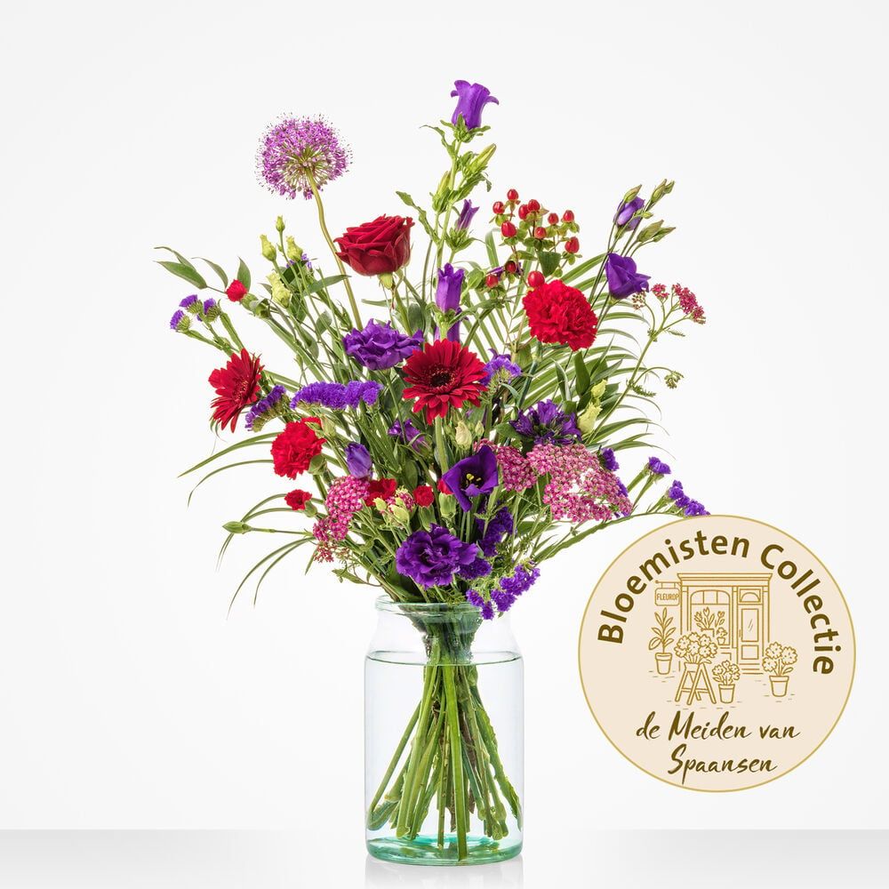 Bloemist Marina van De Meiden van Spaansen in Warmenhuizen heeft exclusief voor Fleurop haar eigen unieke boeket samengesteld. Dit kleurrijke en vrolijke 'Marina-boeket' valt op door de hoog-laagschikking en de dieppaarse en knalrode kleurcombinatie. Het is een levendig, contrastrijk en krachtig boeket, ideaal om jezelf te trakteren of een geliefde mee te verrassen. Maak de ervaring compleet door het boeket te combineren met een passende vaas of met onze heerlijke handgemaakte bonbons en chocolade. Het boeket van Marina maakt deel uit van de 'Bloemisten collectie', een serie boeketten ontworpen door lokale Fleurop bloemisten. Elk boeket toont liefde voor het vak en passie voor bloemen, met een unieke stijl en bindwijze die kenmerkend zijn voor de bloemist. Houd er rekening mee dat het geleverde boeket kan afwijken van de foto, omdat bloemen natuurproducten zijn.