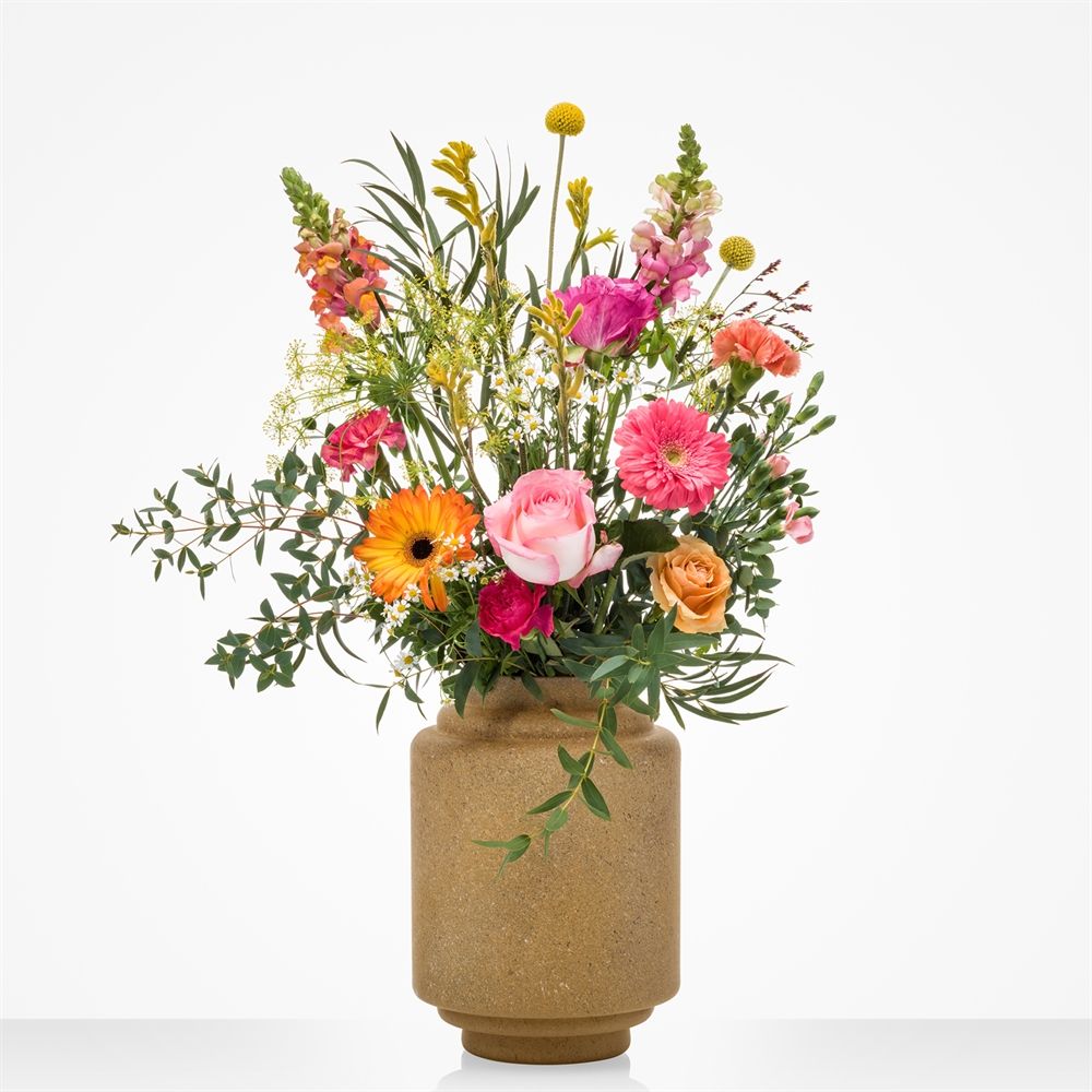 Breng de lente in huis en vier Pasen in stijl met ons prachtige Paasboeket. Een levendige combinatie van bloemen in de warme tinten oranje, roze en stralend geel, zorgt voor een frisse en vrolijke sfeer. Ons Paasboeket is een echte eyecatcher en brengt d