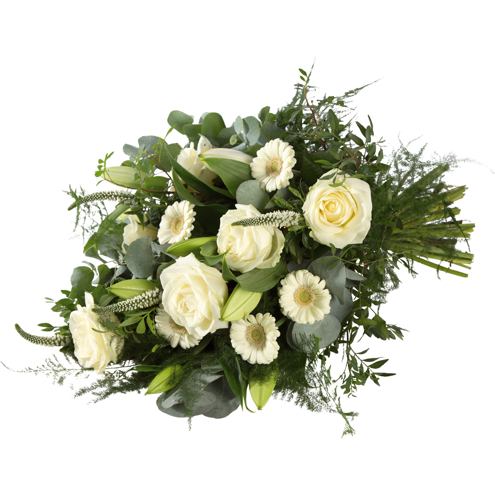 Sereen wit rouwboeket dat liggend wordt gepresenteerd, excl. ondergrond, vaas en lint.