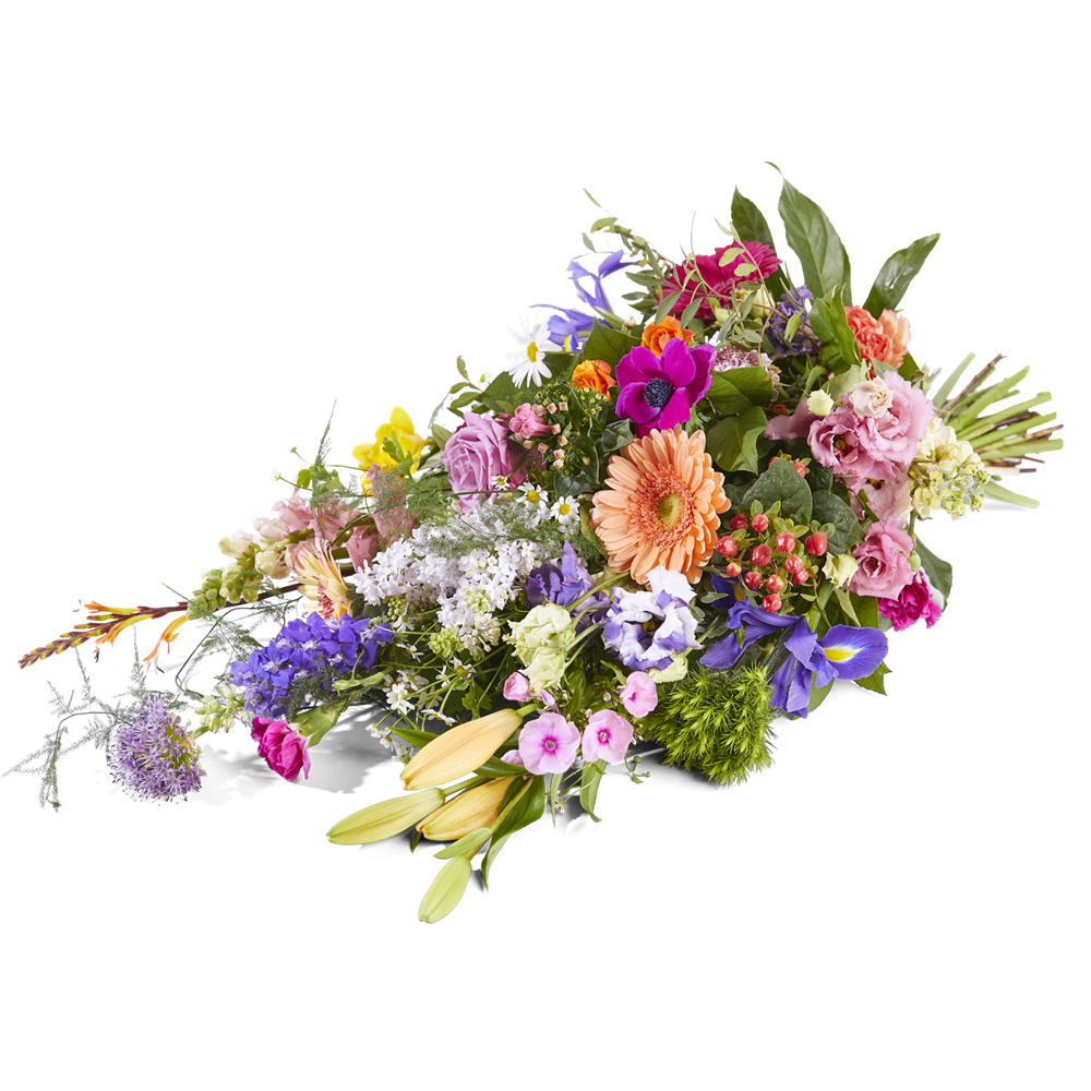Dit rouwboeket in warme bonte kleuren is een prachtig rouwboeket voor een waardig afscheid.