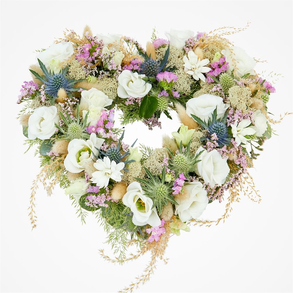Een betoverend rouwstuk in de vorm van een hart voor een speciaal afscheid. Het rouwboeket Eeuwig hart combineert natuurlijke bloemen, prachtige grassen en droogmaterialen voor een uniek en speels ontwerp. De pastelkleuren en de hartvorm maken dit boeket tot een prachtig eerbetoon. Kies uit de formaten 25cm of 65cm voor een passend gebaar. Onze toegewijde klantenservice controleert elke rouwbestelling persoonlijk, zodat het arrangement perfect wordt samengesteld. Laat onze ervaren bloemisten de rouwbloemen bezorgen op de gewenste locatie, zoals een kerk, rouwcentrum of crematorium. Geen gedoe met ophalen; wij garanderen dat het rouwboeket op tijd aankomt en in volle bloei staat. Een troostende gedachte in moeilijke tijden. Laat ons zorgen voor een waardig afscheid, waar dan ook in Nederland.