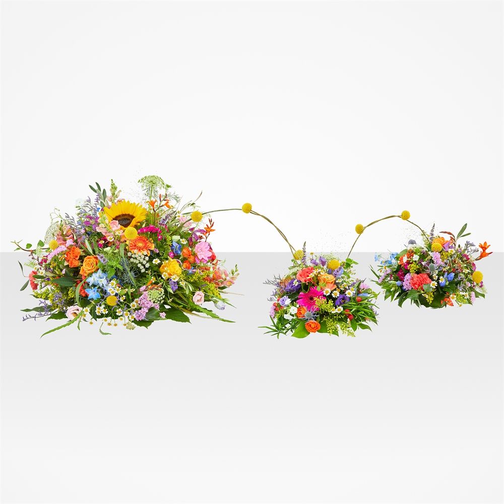 Het bloemstuk 'Eeuwige verbinding' is een levendig en eigentijds eerbetoon, bestaande uit een groot 50cm rond bloemstuk en twee kleinere 30cm ronde bloemstukken. Breid het bloemstuk uit met één of twee extra kleine bloemstukken voor een nog grotere impact. Dit kleurrijke rouwstuk straalt uitbundigheid uit dankzij zijn unieke vorm en krachtige tinten. Met bloemen die bloeien tijdens warme seizoenen, biedt dit rouwstuk een eigenzinnige twist. Geniet van gemoedsrust, want al onze rouwbestellingen worden zorgvuldig gecontroleerd door ons toegewijde klantenserviceteam. Laat onze bloemisten jouw rouwbloemen op elke gewenste locatie bezorgen, van kerken tot rouwcentra en crematoria. Geen gedoe met ophalen, want onze bloemisten zorgen ervoor dat het rouwboeket op het juiste moment en op zijn mooist aankomt. Een troostende gedachte in moeilijke tijden.