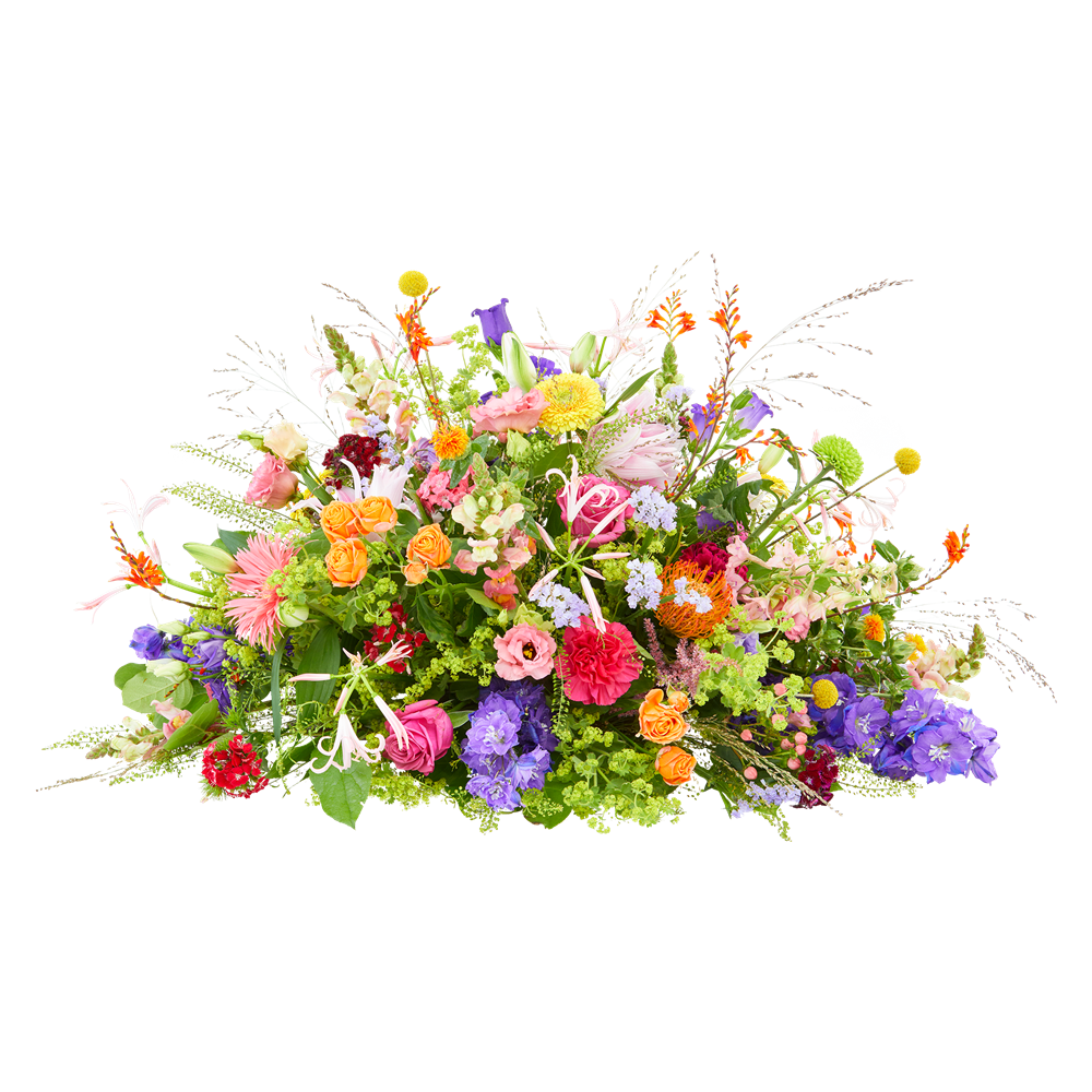 Het ovale rouwstuk Kleurenpracht: tijdloos, veelkleurig en opvallend. Bestel dit kleurrijke rouwstuk voor een liefdevol en warm afscheid. Iedere rouwbestelling wordt persoonlijk gecontroleerd en naar wens samengesteld. De rouwbloemen worden bezorgd op een locatie naar keuze, zodat je je geen zorgen hoeft te maken over het ophalen. De bloemist zorgt ervoor dat het rouwboeket op het juiste moment wordt bezorgd en prachtig is, een extra fijne gedachte in een verdrietige periode.