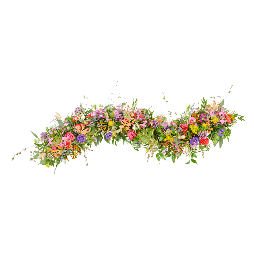 Kleurgolf: kleurrijk en uitbundig rouwstuk met krachtige kleuren Ontdek Kleurgolf, een eigenzinnig rouwstuk met levendige kleuren. De bloemen die hierin verwerkt zijn, zijn voornamelijk te vinden tijdens de warmere periodes van het jaar. Dit prachtige rouwstuk is verkrijgbaar in drie maten: 100cm (klein), 120cm (middel) en 140cm (groot). Wist je dat elke bestelling met rouwwerk persoonlijk en handmatig gecontroleerd wordt door onze klantenservice medewerkers? Hierdoor garanderen wij dat het rouwstuk met zorg en naar jouw wensen wordt samengesteld. Onze ervaren bloemisten bezorgen de rouwbloemen op de door jou gekozen locatie, of het nu bij een kerk, rouwcentrum of crematorium is. Je hoeft dus niet zelf naar de bloemist te gaan om het rouwstuk op te halen. Onze bloemisten zorgen ervoor dat het rouwboeket op het juiste moment bezorgd wordt, zodat de bloemen stralen op het moment dat het nodig is. Een geruststellende gedachte gedurende een verdrietige periode.