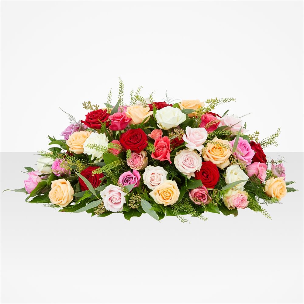 Het prachtige ovale rouwstuk "Laatste kus": een eerbetoon in warme, kleurrijke tinten met bijzondere rozen. Klassiek-moderne stijl, verkrijgbaar in 3 maten. Persoonlijke controle van elke rouwbestelling. Bezorging op locatie in heel Nederland. Geen zorgen, laat de bloemist het rouwstuk op het juiste moment leveren. Gemoedsrust in droevige tijden.