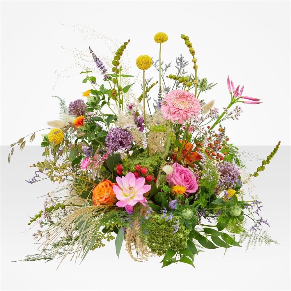 Het rouwboeket 'Natuurlijk geplukt' is een eigentijds en luchtig boeket in zachte kleuren, geïnspireerd door de natuur. Het biedermeier rouwstuk is stijlvol met natuurlijke bloemen, speciale grassen en droogmaterialen. Een unieke compositie die speelsheid uitstraalt. Beschikbaar in 30cm, 40cm of 50cm. Dit ronde bloemstuk is samengesteld volgens de traditionele Biedermeier techniek, waardoor elk detail vanuit elke hoek te bewonderen is. Bij elke bestelling met rouwbloemen wordt persoonlijke aandacht en zorg gegarandeerd. De rouwbloemen worden op de gewenste locatie geleverd, zonder dat je zelf naar de bloemist hoeft. Onze ervaren bloemist zorgt ervoor dat het rouwboeket op het juiste moment aankomt, stralend en vers. Een geruststellende gedachte in moeilijke tijden. Ontdek nu dit prachtige rouwboeket en geef een bijzonder eerbetoon.