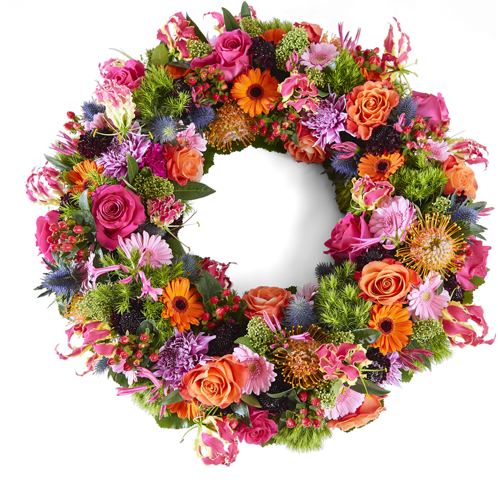 De rouwkrans 'Oneindige kleuren' is een warme en licht exotische rouwkrans, samengesteld met bloemen die van de late zomer tot de vroege winter bloeien. Denk hierbij aan bessen, grassen, dahlia's en prachtige hortensia's. Deze rouwkrans is verkrijgbaar in drie verschillende maten: 40cm, 60cm en 80cm. Een rouwkrans symboliseert oneindigheid en kan naast, bij of op de kist geplaatst worden. Tijdens de afscheidsceremonie of herdenking is het ook mogelijk om de krans op een standaard te plaatsen. Het bestellen van rouwbloemen bij ons betekent persoonlijke aandacht en zorgvuldige controle door onze klantenservicemedewerkers. Zo garanderen wij dat het rouwarrangement volledig aan jouw wensen voldoet. Onze ervaren bloemisten bezorgen de rouwbloemen op de door jou gekozen locatie, of het nu een kerk, rouwcentrum of crematorium is. Je hoeft dus niet zelf naar de bloemist, wij regelen de bezorging op het juiste moment, zodat de bloemen op hun mooist zijn wanneer ze arriveren. Dat is een geruststellende gedachte in een moeilijke tijd.