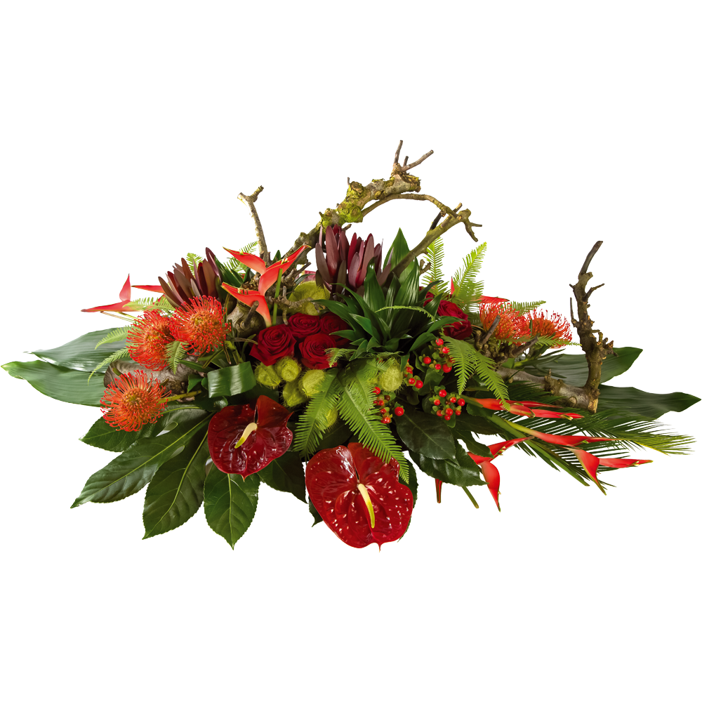 De exotische heliconia smaakvol gecombineerd met nutan en anthurium. Excl. lint..