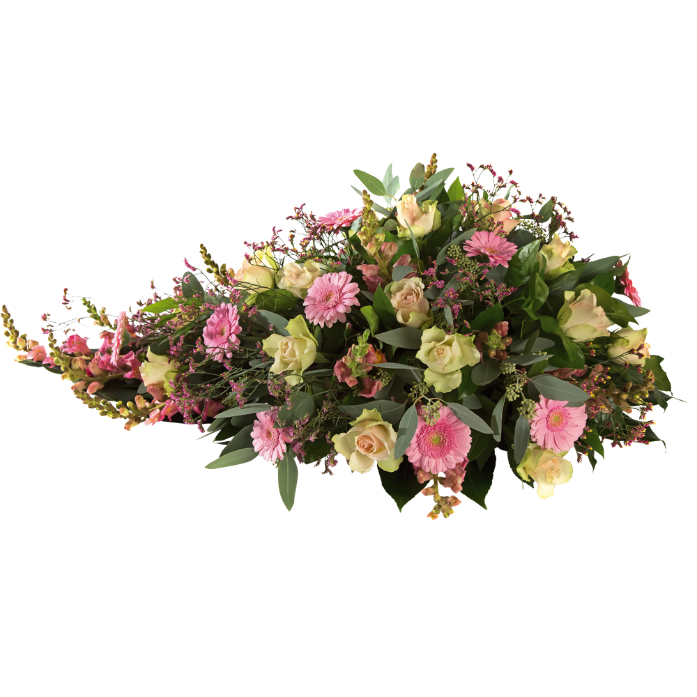 Prachtig arrangement in zachte tinten voor het afscheid van een geliefde. Excl. lint.