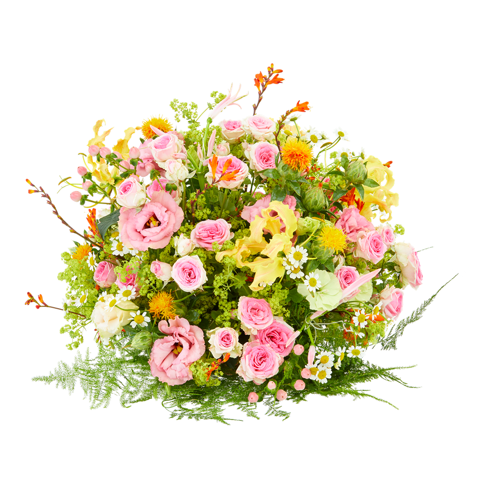 Het ronde rouwstuk Rozengeur is een modern en luchtig arrangement van bloemen in zachte, warme kleuren. Dit bloemstuk wordt op ambachtelijke wijze samengesteld in ronde vorm, bekend als de Biedermeier-stijl. Door deze bindtechniek zijn de bloemen vanuit alle hoeken goed zichtbaar. Je hebt de keuze uit drie maten: 30cm (klein), 40cm (middel) of 50cm (groot). Bij iedere bestelling met rouwbloemen wordt een persoonlijke handmatige controle uitgevoerd om ervoor te zorgen dat het bloemstuk volledig aan jouw wensen voldoet. Bezorging van het rouwarrangement is mogelijk op elke gewenste locatie, zoals bij een kerk, rouwcentrum of crematorium. Je hoeft dus niet zelf naar de bloemist te gaan, want deze zorgt ervoor dat het rouwstuk op het juiste moment wordt afgeleverd en de bloemen op hun mooist zijn. Een geruststellende gedachte in een moeilijke tijd.