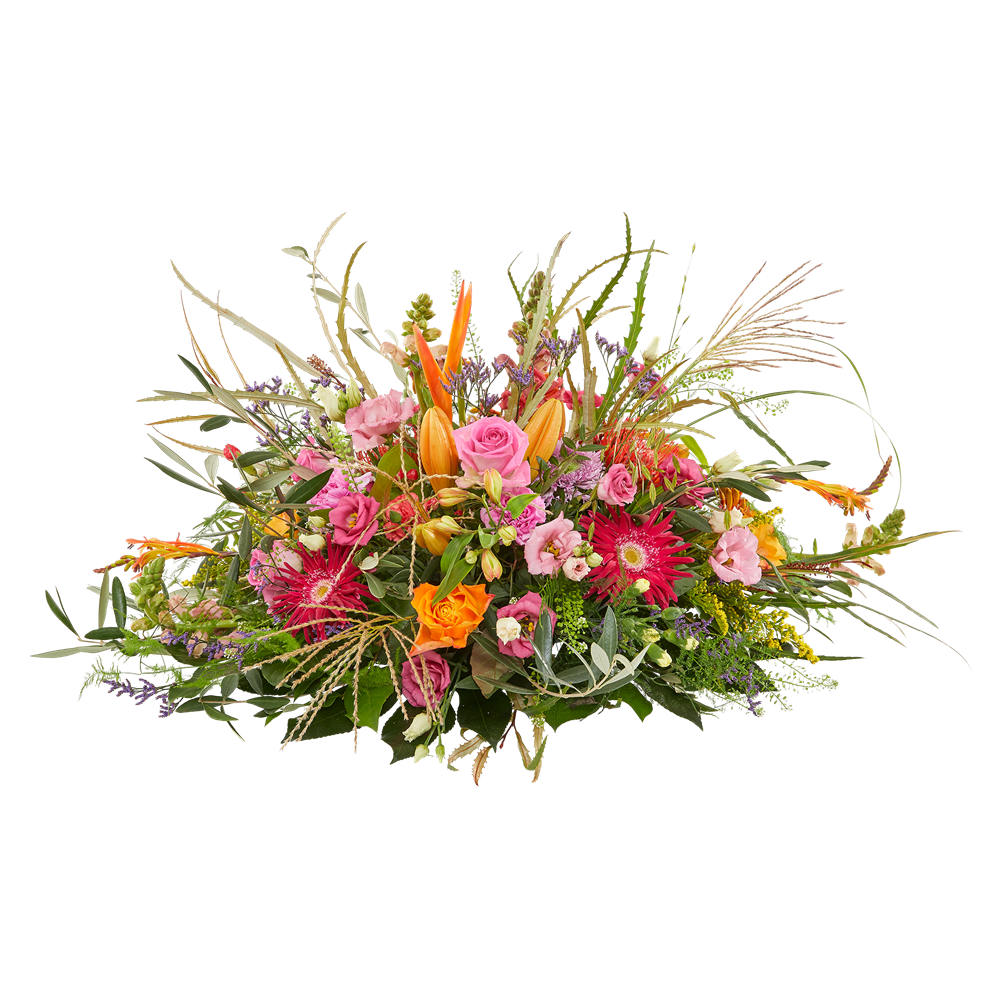 Het ovale rouwstuk Springerige Warmte: modern en kleurrijk | Warm Gebaar Thema | Exotische en tropische touch | Prachtig voor een waardig afscheid Het ovale bloemstuk Springerige Warmte is een eigentijds en kleurrijk rouwstuk in het kader van het Warm Gebaar thema. Gekenmerkt door zijn warme kleuren, is dit bloemstuk met zijn subtiele exotische en tropische touch een prachtige keuze voor een mooi en respectvol afscheid. Samengesteld uit bloemen die veel voorkomen tussen de laatste warme dagen en de eerste koude dagen, bevat dit rouwstuk onder andere bessen, grassen, dahlia's en prachtige hortensia's. Beschikbaar in maten van 60cm (klein), 80cm (middel) en 100cm (groot), elk rouwarrangement wordt persoonlijk en zorgvuldig gecontroleerd om volledig aan uw wensen te voldoen. De rouwbloemen worden geleverd op een locatie van uw keuze, zoals een kerk, rouwcentrum of crematorium. U hoeft het rouwstuk niet op te halen, dit wordt op het juiste moment bezorgd door de bloemist, zodat de bloemen op hun mooist zijn. Een geruststellende gedachte in een moeilijke tijd.
