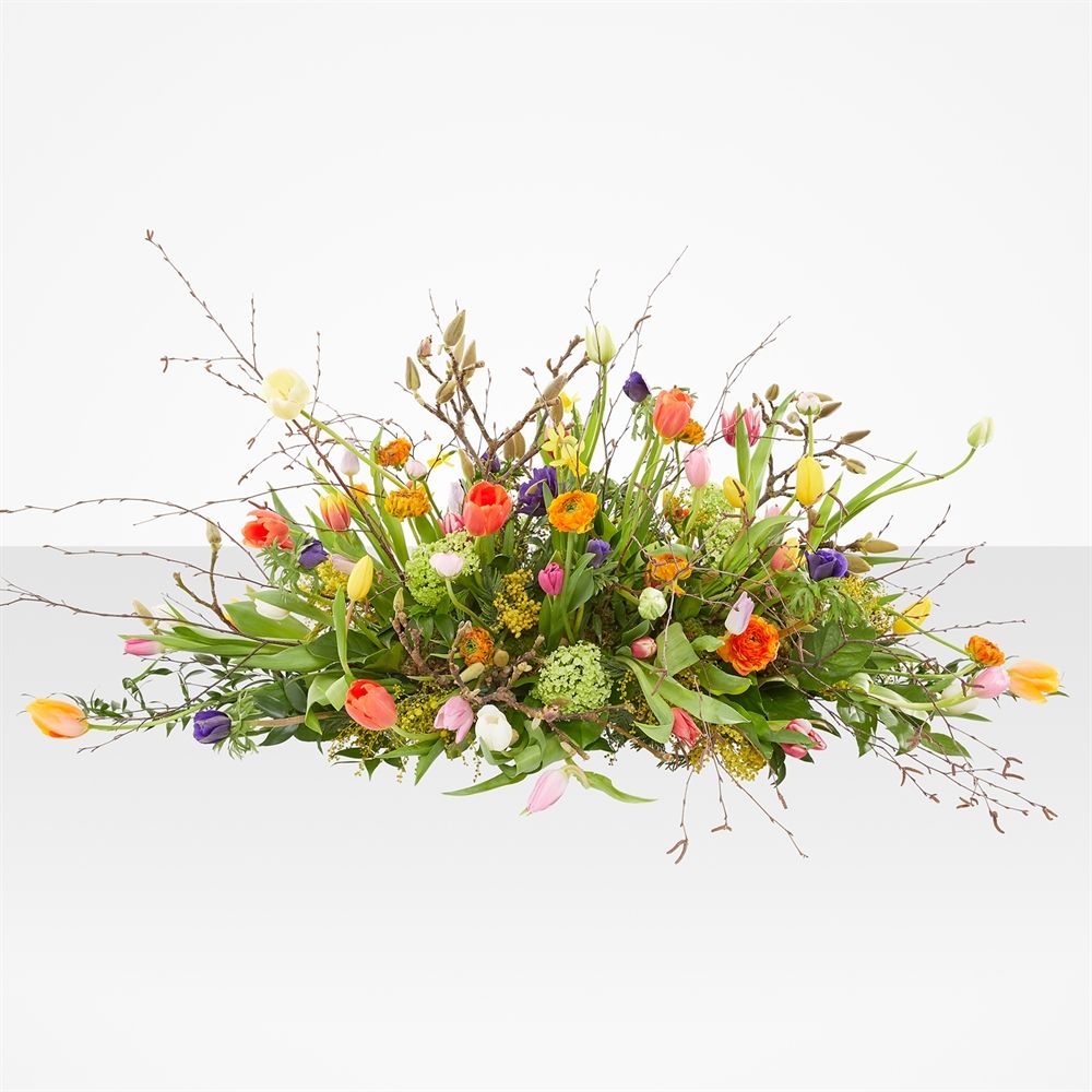 Een uniek ovale rouwstuk met prachtige seizoensbloemen, verkrijgbaar in diverse formaten. Onze klantenservice zorgt voor een persoonlijke controle. Vertrouw op onze lokale bloemisten voor een gedenkwaardige levering.