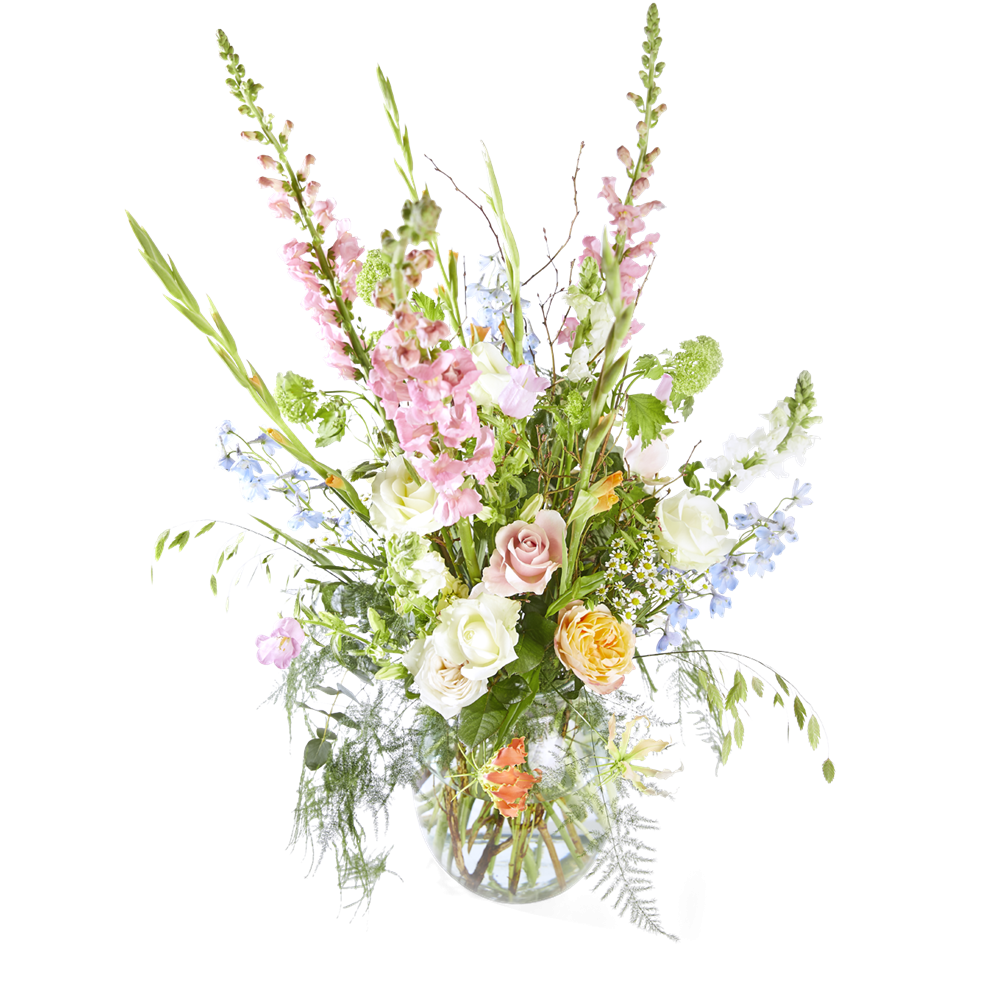 Houd de liefde volop in leven met deze stijl van bonte zachte kleuren. inclusief vaas. Goed om te weten: de Delphinium is in deze periode van het jaar minder goed beschikbaar en kan door de lokale bloemist worden vervangen door een andere, vergelijkbare
