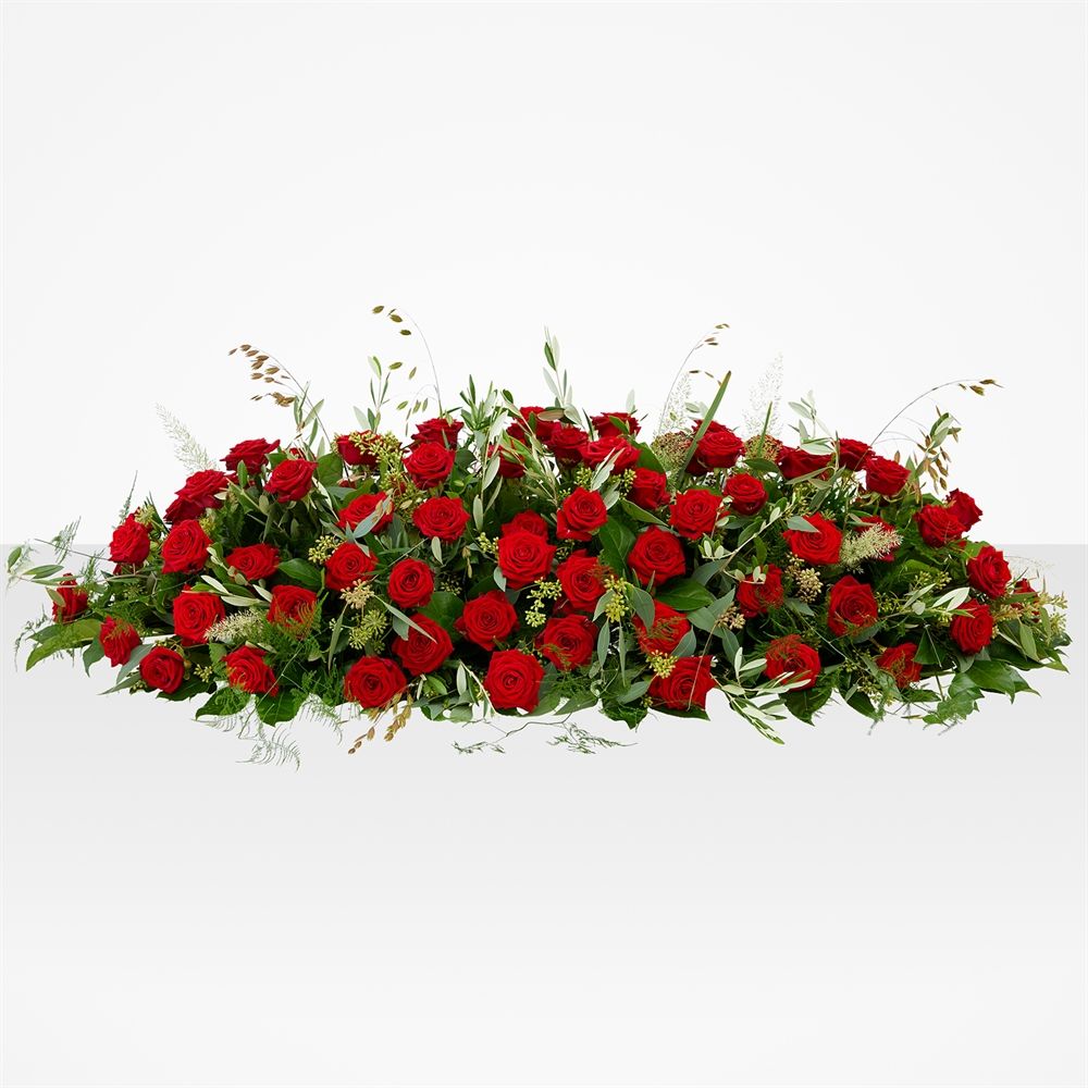 Een tijdloos rood rouwstuk met bijzondere rozen. Persoonlijk bezorgd op elke locatie in Nederland. Bedekt de hele kist met warme bloemenpracht. Verras met een liefdevol afscheid. Beschikbaar in verschillende formaten. Gegarandeerd perfect samengesteld. Laat onze bloemisten uw rouwstuk bezorgen op het gewenste moment. Een troostende gedachte in moeilijke tijden.