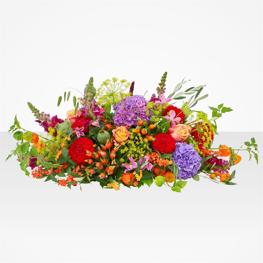 Ontvang het ovale bloemstuk Warme Weelde in verschillende afmetingen: 60 cm (klein), 80 cm (middel) of 100 cm (groot). Dit compacte, moderne en kleurrijke bloemstuk straalt warmte uit met prachtige seizoensbloemen van topkwaliteit. Bij elk afscheid zorgt dit bloemstuk voor een persoonlijke en liefdevolle touch. Onze zorgvuldige controle verzekert dat elk rouwstuk volledig naar wens wordt samengesteld. De rouwbloemen worden bezorgd op een locatie naar keuze, zoals een kerk, rouwcentrum of crematorium. Geen noodzaak om het rouwstuk zelf op te halen, onze bloemist zorgt voor een tijdige levering en optimale verse bloemen. Een geruststellende gedachte in moeilijke tijden.